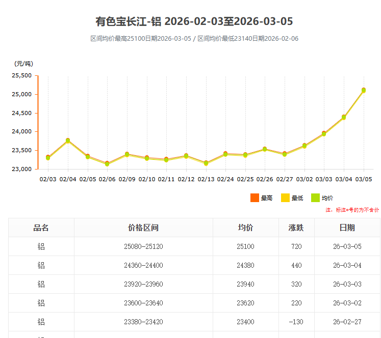 進入2026年3月,國內鋁錠價格迎來新一輪強勢上漲。根據(jù)長江有色網(wǎng)最新數(shù)據(jù),3月5日鋁錠均價已飆升至25100元/噸,單日漲幅高達720元,創(chuàng)下近階段新高。這一劇烈波動不僅牽動著上游電解鋁企業(yè)的神經(jīng),更對下游工業(yè)鋁型材 加工行業(yè)帶來了嚴峻的成本考驗。